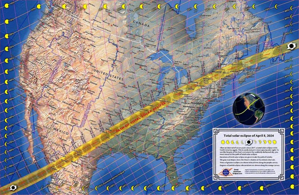 Today we have a once in many of our lifetimes a total solar eclipse. Its going to be the longest time in totality we have seen. The great eclipse of 2017 started here in Oregon and we were in the path of totality and the time in total darkness was just a hint over 2 minutes. The one today, will have a 4 minutes and 32 seconds of darkness that’s more than double the one in 2017. So this is a big deal this is a great map and shows you the path as well as the moon as it traverses the sky during the eclipse. The New Moon will is at 253,000 miles from the Earth the new moon during the eclipse will be approximately 223,600 miles from the earth at its closest point per Google and NASA.